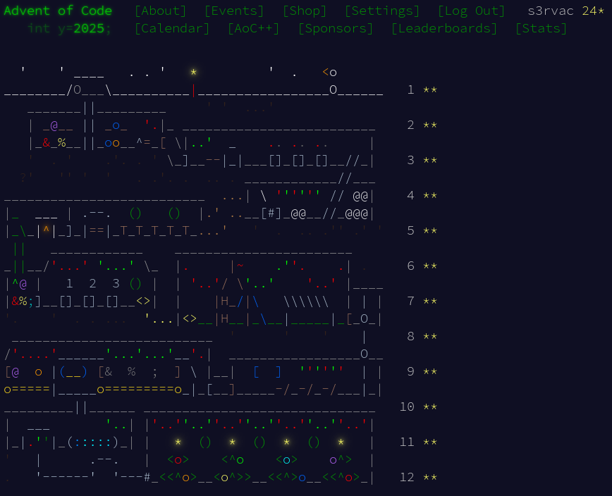 Velkou změnou v roce 2025 byl poloviční počet úloh. Konkrétně místo 25 úloh jich bylo pouze 12. To, zda se jedná o změnu k lepšímu či horšímu nechávám na zvážení každého. Mně se osobně víc líbil původní formát s 25 úlohami, ale chápu, že vytvořit je dá zabrat. Taktéž mi přišlo, že úlohy byly tentokrát méně zajímavé než předchozí roky.